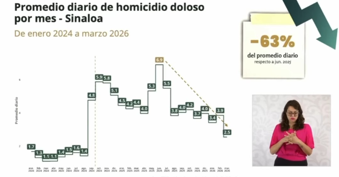 Detalló que el punto más alto de este delito se alcanzó en junio de 2025 con un promedio de 6.9 casos diarios, sin embargo, para marzo de este año se redujo 63 por ciento al registrar un promedio de 2.5 casos; mientras que en el comparativo anual, la reducción es del 28 por ciento en 2026, a comparación de lo registrado en 2025 que estalló el conflicto entre organizaciones de la delincuencia organizada.
