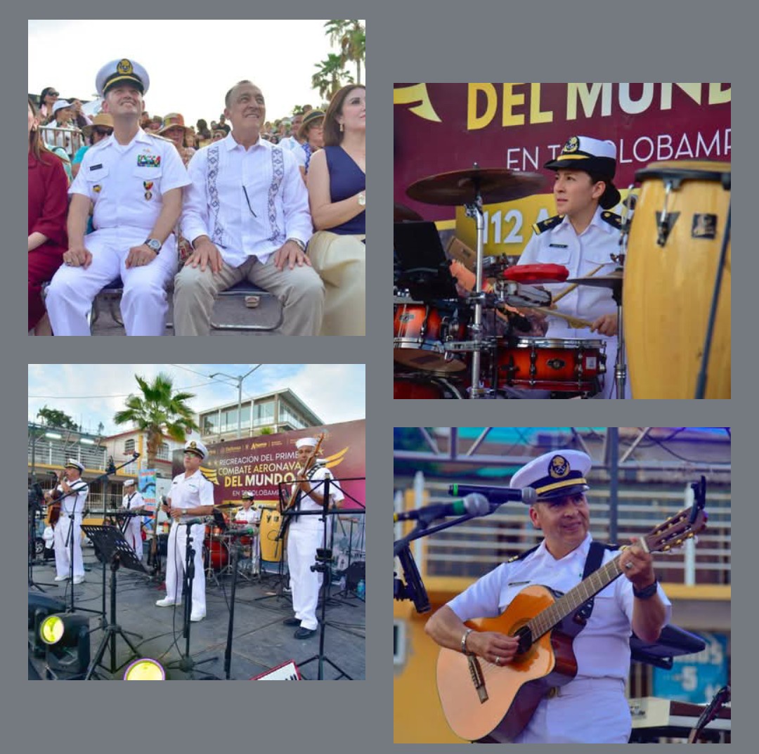 Cabe citar que ambos grupos musicales de las Fuerzas Armadas están de visita en Ahome como parte de la celebración del primer combate aeronaval del mundo en Topolobampo, y el pasado domingo ofrecieron un magno concierto en el kiosco de la Plazuela 27 de Septiembre en Los Mochis, donde también pusieron a bailar y cantar a las familias asistentes.